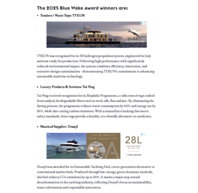 Boat International highlights the celebration of the winners of the Monaco Yacht Show new sustainability initiative: Blue Wake. The event welcomed over 400 guests, including Monaco officials, Blue Wake programme exhibitors, leading sponsors, private clients, and prominent figures from the yachting industry.