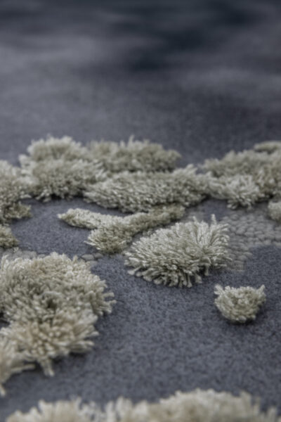 An homage to bleached coral reefs, this rug makes use of felted wool and silk to suggest aquatic vegetation on a now-broken shoreline. Pale, ivory tufts bloom out of a dynamic, inky background.