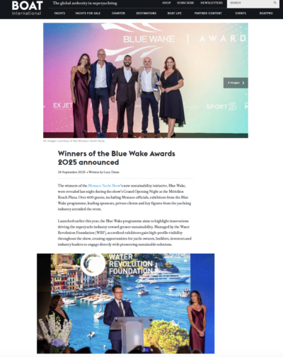 Boat International highlights the celebration of the winners of the Monaco Yacht Show new sustainability initiative: Blue Wake. The event welcomed over 400 guests, including Monaco officials, Blue Wake programme exhibitors, leading sponsors, private clients, and prominent figures from the yachting industry.