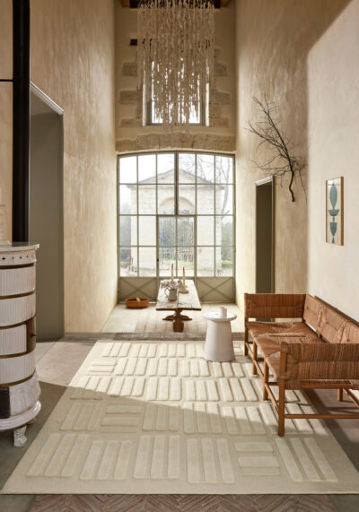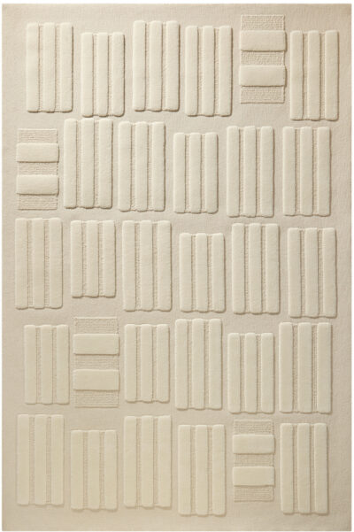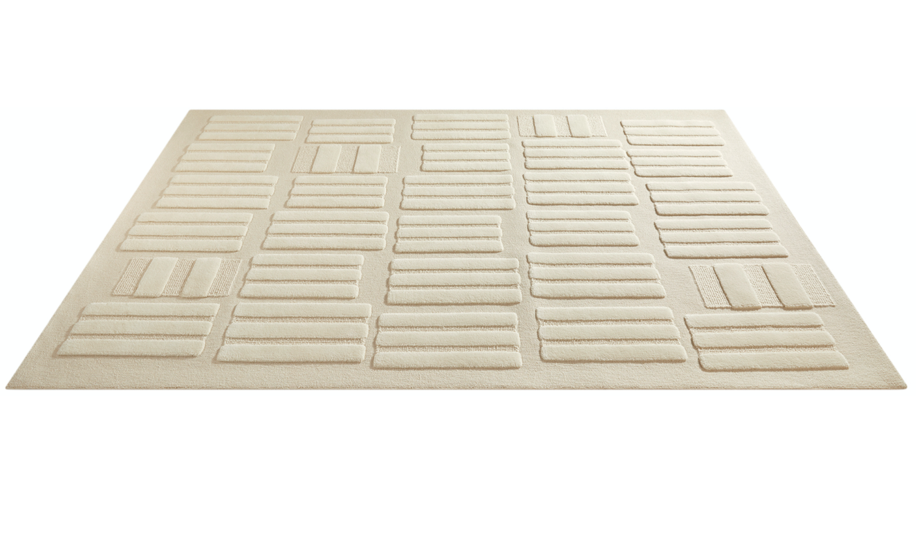 Repetition of similar yet distinct forms imbue this carpet with a sense of capricious irregularity. Sound draws inspiration from a construction technique called ‘pisé’ wherein raw materials such as straw and earth are compacted together to produce building blocks.